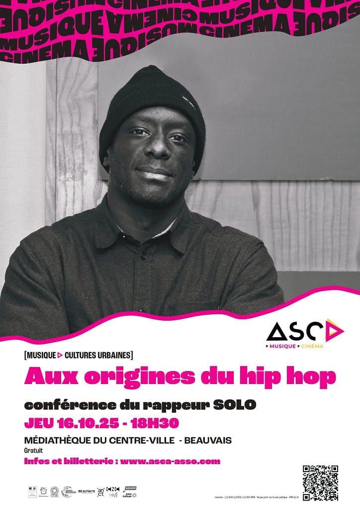 Hey Yo ! Voici la conférence que j’animerai le jeudi 16 octobre 18h30 à la Médiathèque du Centre Ville de Beauvais en partenariat avec l’Asca & BROK RADIO ! Solo aka S.O.L.O est à lui seul un précurseur de la culture Hip Hop en France. Membre des PARIS CITY BREAKERS Apparition Tv sur la première émission H.I.P H.O.P Rappeur fondateur du groupe ASSASSIN Directeur Artistique de la Bande Originale Inspirée du film La Haine Dj, Beatmaker et Producteur Rap Mannequin égérie de grandes marques et comédien Ecrit de son récit de vie « Note mon nom sur ta liste » livre paru le 14 novembre 2024 aux éditions MASSOT Venez à sa rencontre pour (re)découvrir un activiste de talent le jeudi 16 octobre 2025 à 18h30 !